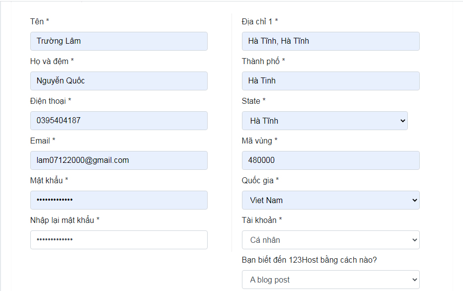 Bước 3: Điền thông tin đăng ký của các bạn vào ( Đúng họ tên, số điện thoại, email vì nếu bên 123HOST nghi ngờ bạn cung cấp thông tin không xin xác thì sẽ có nhân viên liên hệ yêu cầu xác mình thêm bằng CMND hoặc gọi điện thoại để xác nhận.)